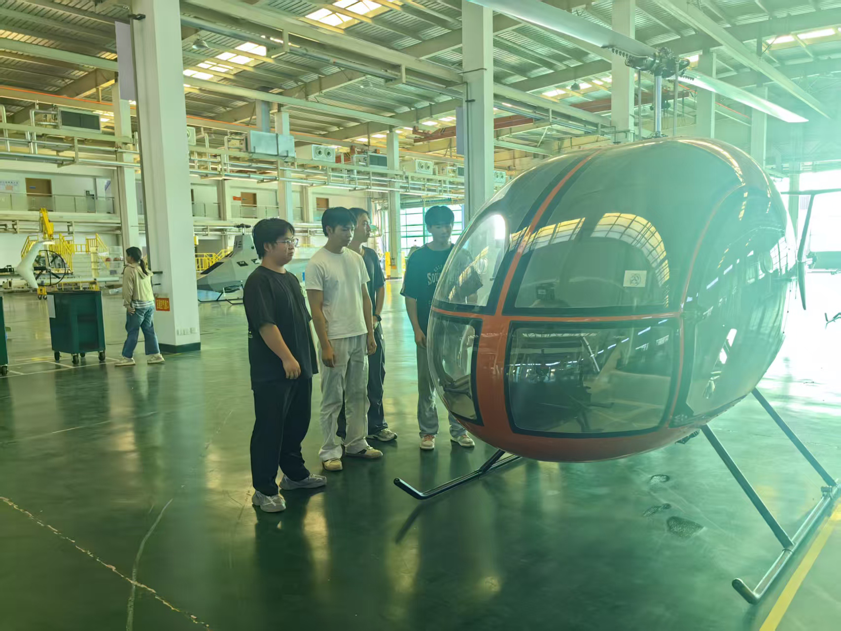 在江直公司企业技术人员带领下,代表团先后参观了直升机总装车间和精密零部件加工区,直观了解航空装备从零件加工到整机组装的全流程生产工艺。